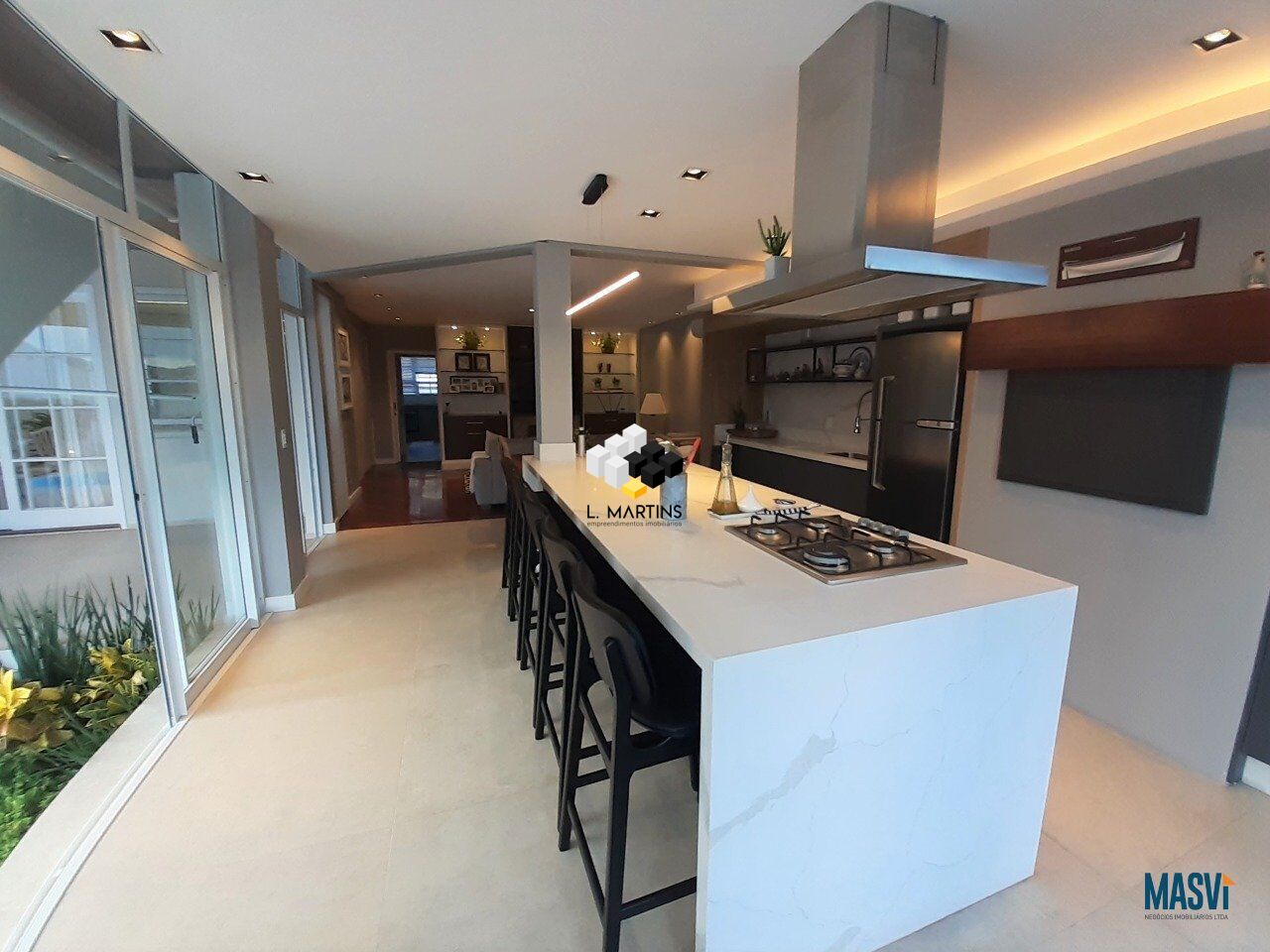 Espaço gourmet com churrasqueira, bancada em ilha, fogão e móveis embutidos, sala de Tv e lareira integrada, piso em cerâmica Portinari.